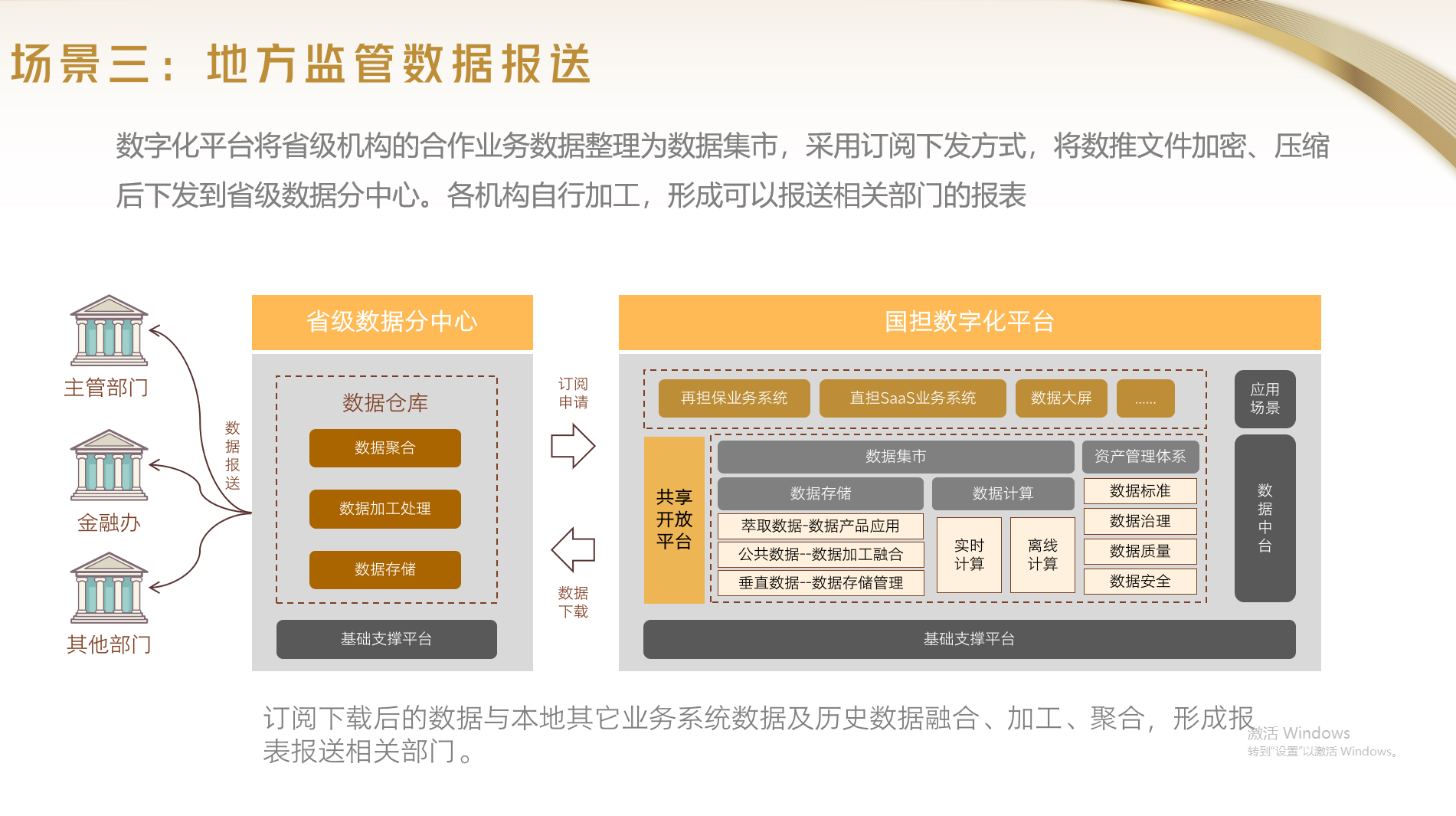 元明科技副總經理王開燦重點介紹了“國擔基金省分中心方案”,他表示,省數據分中心技術架構與國擔基金直擔SaaS平臺一脈相承,按照“互聯(lián)網+擔?!钡脑O計理念,將進一步擴大數字化平臺的開放程度,通過“1+2+N”的數字化生態(tài)平臺,將有效實現(xiàn)央地數據中臺互聯(lián)互通和數據共享,實現(xiàn)地方監(jiān)管數據對接、銀擔系統(tǒng)直連、業(yè)財對接等個性化需求和屬地化需求,將有力提升公司和合作機構的精細化管理水平及風險防控能力。